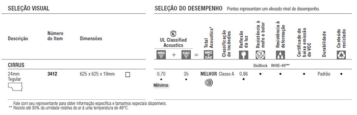 Possui garantia de 30 anos contra deformações visíveis (Humiguard Plus) e o crescimento de fungos, mofo e bactérias (Bioblock Plus), quando usado com perfil de suspensão Armstrong.